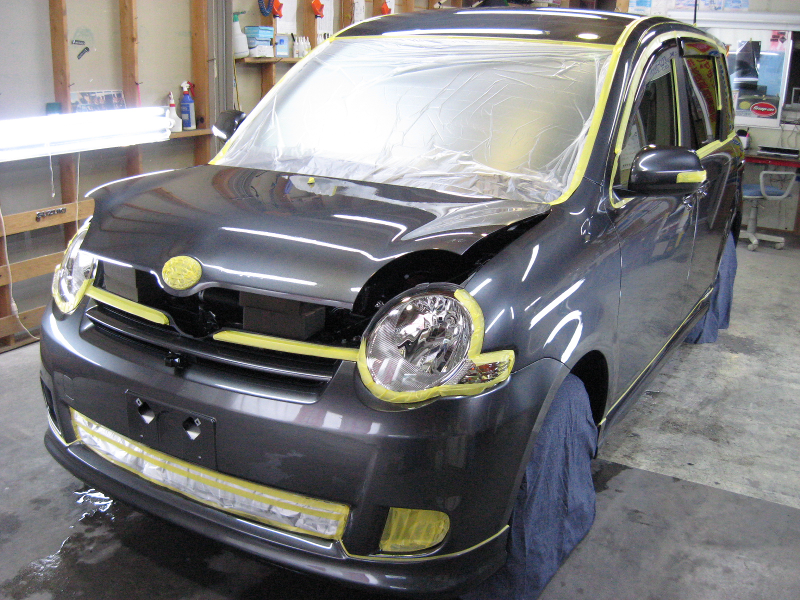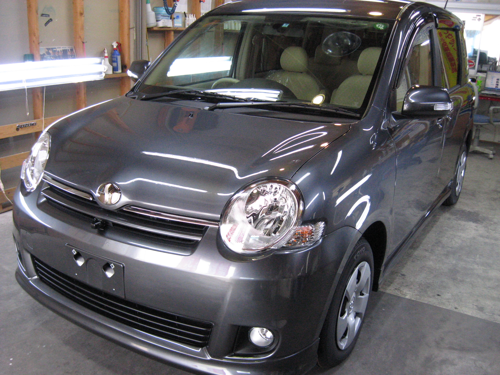 新車での施工となりますが下地処理はキッチリと行います。新車の塗装面は見た目はキレイですが実際には、保護フィルムの糊残り、傷汚れ・・等ついている場合があります。某ディーラーではタイヤワックスを塗り納車するところもあります、塗り方にもよりますが、ほとんどがフェンダー、ライナー、アルミホイールはベトベト状態です。シャンプー洗車だけでは油分は落ちません。コーティング作業とコーティング剤の定着に悪影響です。タイヤワックスの塗り方はスプレーで直接タイヤに吹き付けるのではなく、スポンジ等に少量つけ、ムラなくうすく塗り伸ばし、よく乾燥させることです。又タイヤワックスも油性と水性があり成分にもよりますがタイヤのためには水性をおすすめします。余談となりましたが、シエンタ完成です。ありがとうございました。