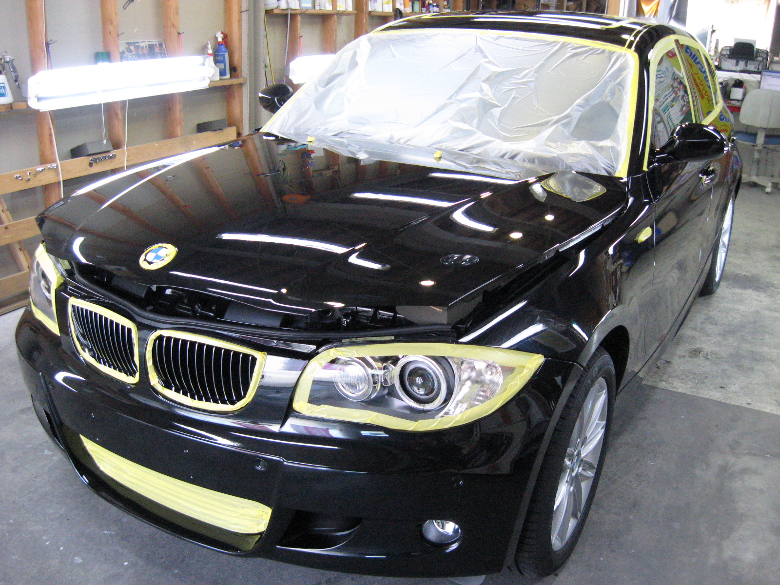 BMW130i フィルム施工・GT−Cガラスコーティング施工のご依頼です。1シリーズは当店でも施工の多い車種ですが中でも130は上級クラスで値段も高価、3シリーズとほぼ変わりません。(ちょっと高いかも!)当店初入庫です。まずはフィルム施工からリヤにはGY−5IR、フロントガラスにはIR−25HDと、どちらも人気のカラーです。特にIR−25HDは、ユズ肌、くすみ、が全くと言っていいほどありません。以前他メーカーのフィルムを使用したことがありましたが、ユズ肌(柚子のようなボコボコしたフィルムの肌)があり、気になると、とても前が見にくくひどい場合は目がくらむようになります。ドアガラスに貼れば気になりませんが、フロントガラスには使用できませんでした。断熱効果も車検対応シリーズの中でもトップクラスです。又フィルムを貼ることでガラスのくもりも軽減されます。おすすめします。つづいてコーティング施工の下地処理に入ります。今回は新車での入庫、しかもボディーフィルムが貼ってある状態でしたので洗車キズ等のダメージもほとんどありませんでした、しかし、細かい隙間やコーナー部分の磨きキズが多々ありますのでよく確認しながら磨いていきます。すべての下地処理が終わったらコーティング作業に入りますが、この時期の塗りこみは気温が高く湿度も高いのでコーティング剤の硬化時間も早く敏速な作業が要求されます。電話、来客等でその場を離れる場合には必ず塗った部分を仕上げてから対応しますのでその際はご了承下さい。(一度硬化しますと研磨するしかありません)全体の塗りこみ作業が終わったら再度確認して完成です。オーナー様は長い海外出張を終え帰国予定日に伴い余裕をもって施工させていただきました。いつまでも大切にお乗り頂きたいと思います。ありがとうございました。