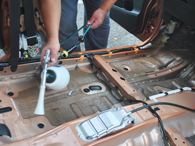 早速ご来店頂き車を確認させていただくと、すでにシート表面は乾いておりましたが、当日はかなり濡れていたようで、フロアーカーペットには水が溜まっていたようです。また、車内のカビ臭がかなりひどい