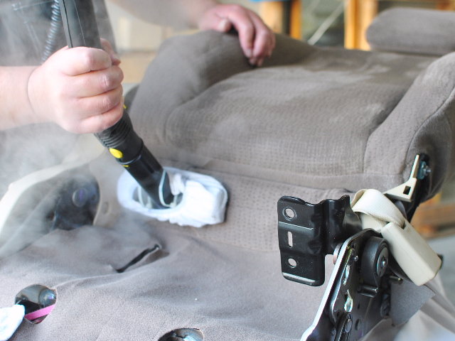 シート背面はセーフでしたが念のためクリーニング、付着した部分はスチーム蒸気をあてるとニオイが上がってきますので確認できます。