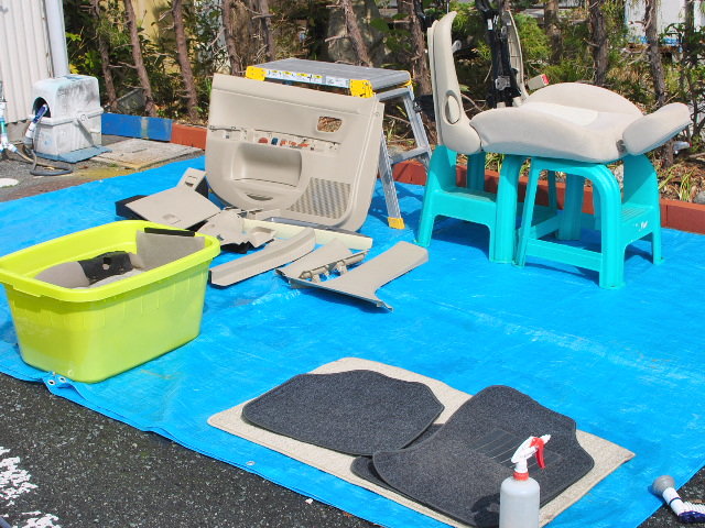 今回はシート(座面)・フロアー・コンソール・ドア内貼り・シートベルト・ガラス。マットは処分