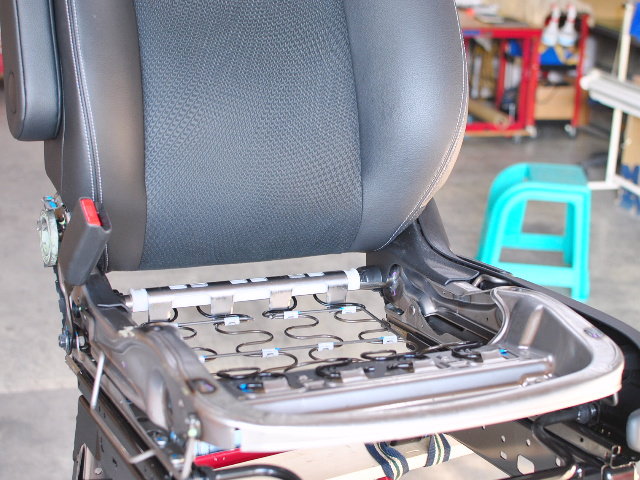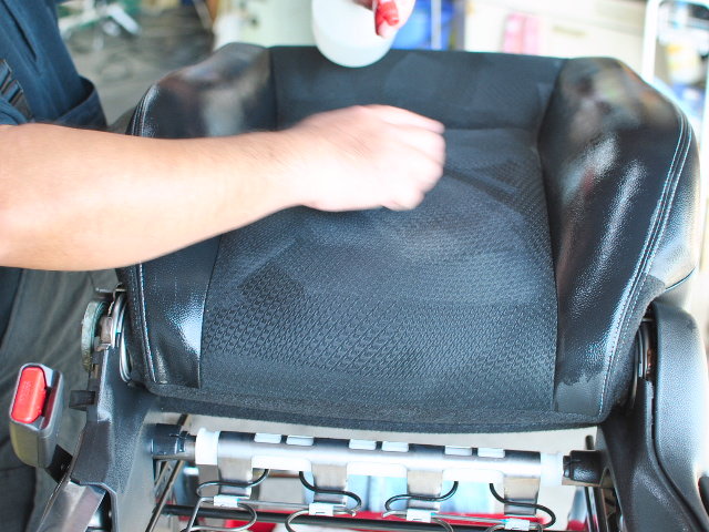 消臭処理完成後、組み付けこのシートはシート生地とスポンジが接着タイプではないのでピンで留めていきます。