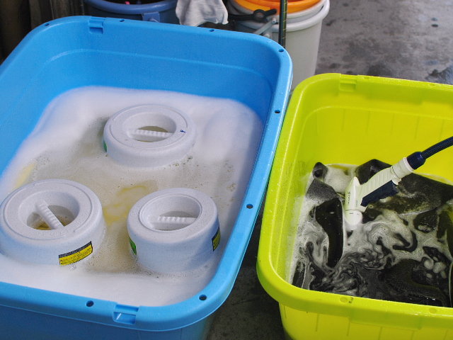 まずは座面部分をとりはずし、生地とスポンジに分け洗浄その後、一晩つけ置きします。