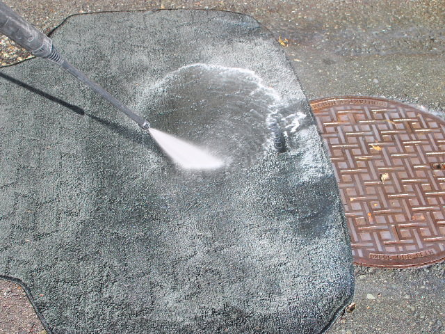 乳化、分解した油分を洗浄します。マットの前側にはまわっていないので洗浄液が付着しないように。