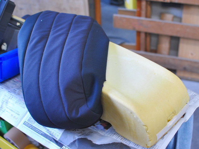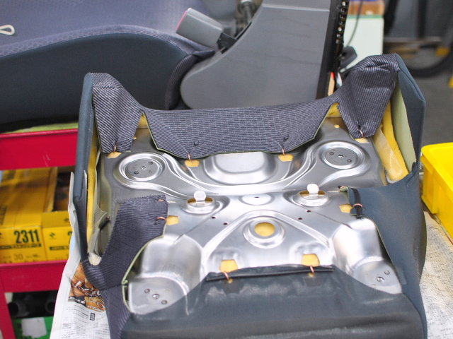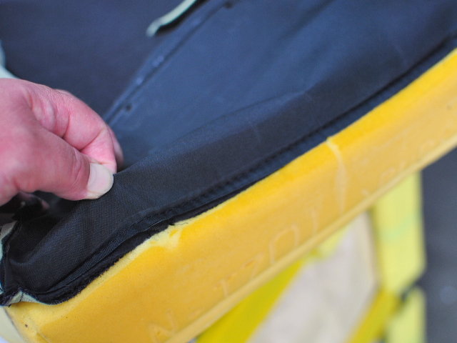早速、座面を取り外します。このシートはスポンジと生地が接着されておりますのでこのままの状態で行います。