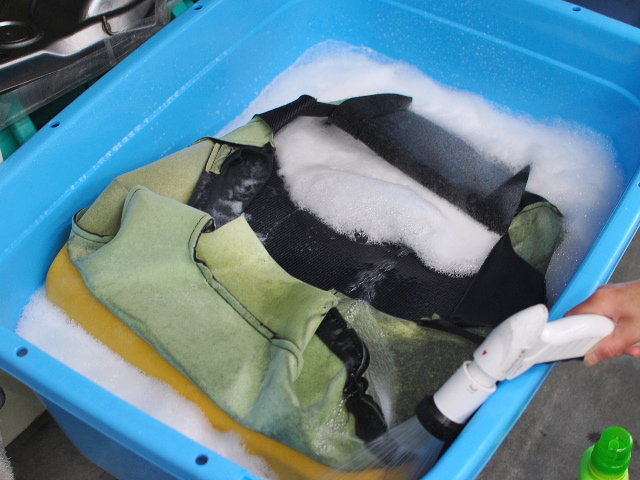 まずは、表面をクリーニングした後、一晩じっくり洗剤に漬け込みます。丸洗いだけではニオイの元(尿)は抜けません。
