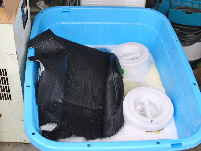 軽く洗浄後、一晩洗剤に漬け込みます。染み込んだニオイの元を完全除去するためです。
