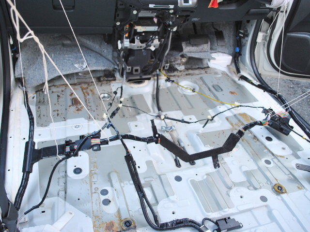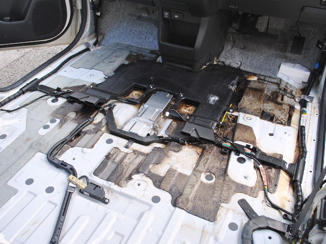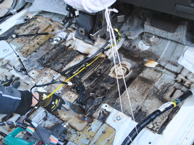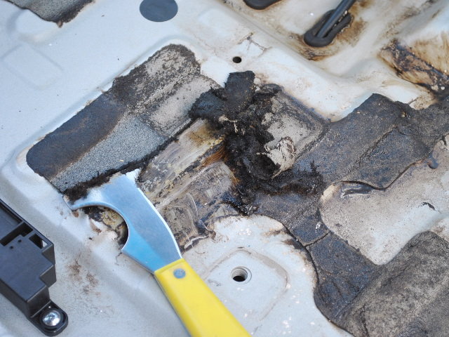 ばらしてみると、スライドドアのステップや前席部分へ流れ込んでおりました。強烈なニオイがします。